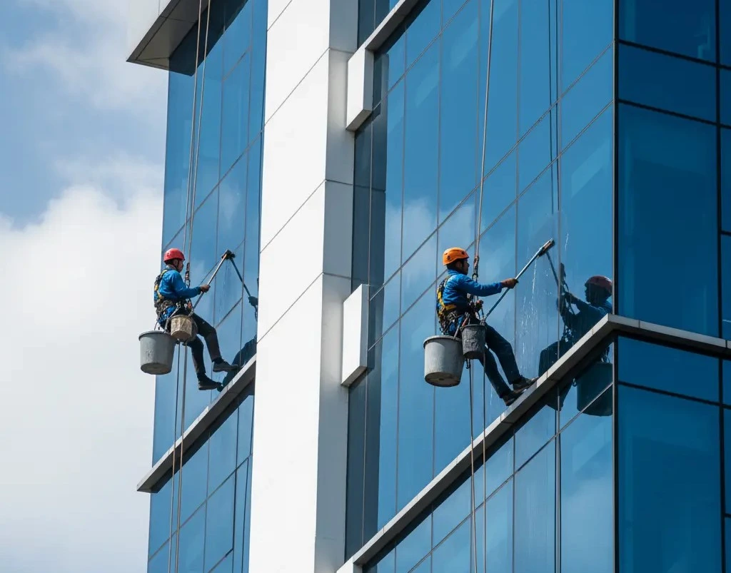 Pembersihan kaca, dinding luar, dan fasad gedung tinggi untuk menjaga tampilan bangunan tetap bersih, profesional, dan terawat.